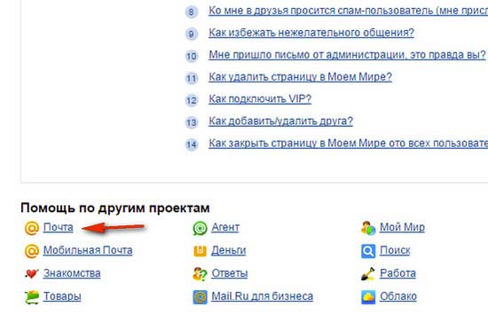 Внимание! Если по клику откроется другой ТОП — например «Мой мир — частые…» — под списком популярных вопросов в разделе «Помощь по другим проектам» перейдите по ссылке «Почта».