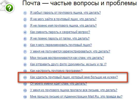 4. Наведите курсор на одиннадцатый вопрос ТОПа «Как удалить почтовый ящик…» и нажмите левую кнопку мышки.