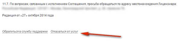 2. Снова воспользовавшись скроллированием (полосой прокрутки), под длинным сводом правил найдите ссылку «Отказаться от услуг» и перейдите по ней (на ПК: наведите курсор и нажмите левую кнопку мышки).