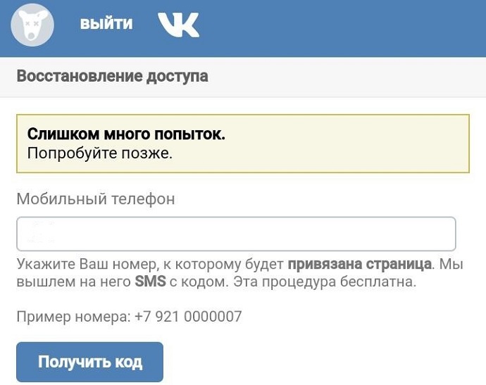 В ВК ошибка с сообщением “Слишком много попыток. Пожалуйста, повторите позже” появляется, по наблюдениям пользователей, при попытке войти на страницу, которая ранее была заморожена администрацией ресурса. Доступ к аккаунту необходимо восстановить через специальную форму, где вводится номер, на который страница была зарегистрирована. Сначала система выдает сообщение о том, что данный номер уже использовался для входа и нужно ввести другой. После нескольких попыток появляется просьба повторить ввод данных позже.