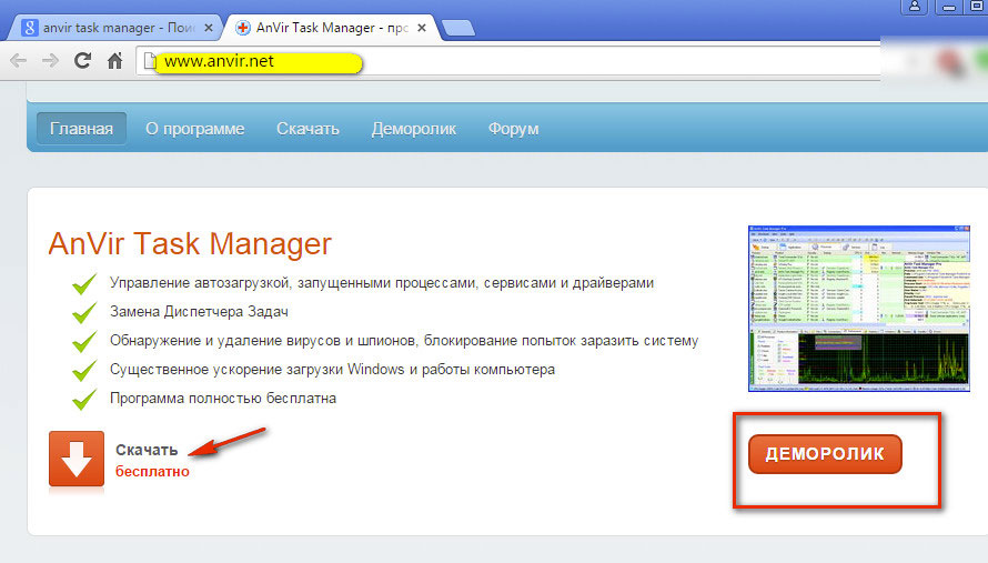 2. В адресной строке наберите anvir.net (офсайт AnVir Task Manager).