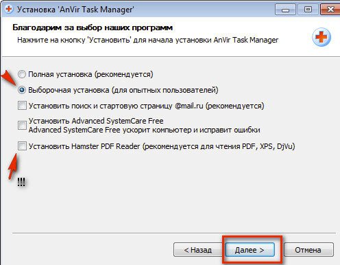 7. Предельно внимательно, чтобы не установить на свой ПК ничего лишнего, на панели инсталлятора включите радиокнопку «Выборочная установка», затем уберите все галочки, находящиеся под этой опцией. И только потом жмите кнопку «Далее».