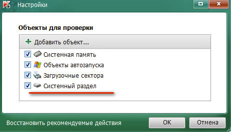 7. В окне «Настройки», в списке элементов, поставьте галочку напротив объекта «Системный раздел». Нажмите «OK».