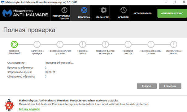 Процесс проверки компьютера с помощью Malwarebytes Anti-malware