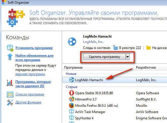 При помощи Soft Organizer удалить Хамачи очень просто и быстро. Скачайте эту утилиту с официального или доверенного сайта, установите на свой ПК и запустите. А затем выполните следующие действия: