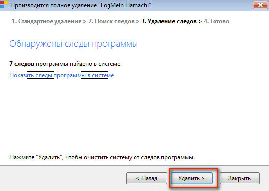 5. После сканирования системы программа сообщит о найденных оставшихся элементах Hamachi и предложит от них избавиться. Для продолжения очистки кликните «Удалить».