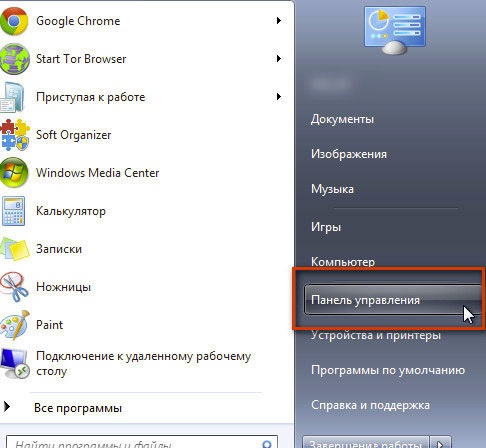 1. Кликните ярлык «Пуск». В панели меню выберите «Панель управления».