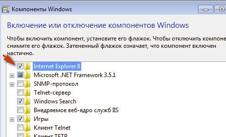 4. В списке компонентов снимите флажок возле «Internet Explorer» (уберите «галочку» кликом мышки).