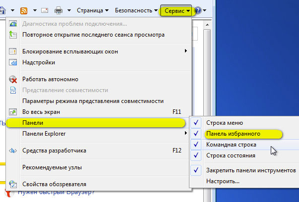Для удобства включите отображение панели меню в верхней части браузера: Сервис → Панели → Панель Избранного.