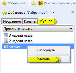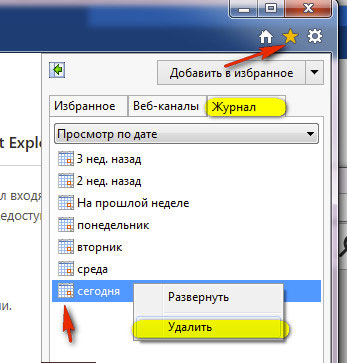 Для выборочного удаления истории нажмите иконку «звёздочка», откройте вкладку «Журнал» и выберите, за какой отрезок времени нужно избавиться от зафиксированных посещений.