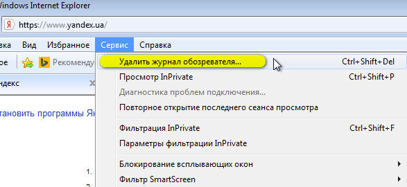 1. В главном меню (горизонтально расположенные опции вверху окна) откройте «Сервис» и нажмите «Удалить журнал… » (для быстрого доступа используйте комбинацию «Ctrl+Shift+Del»).