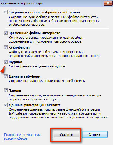 2. В окне «Удаление истории… » установите галочку возле элемента «Журнал» и нажмите кнопку «Удалить».