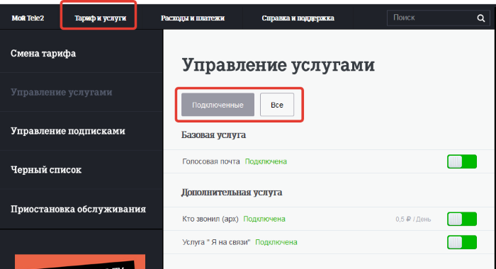 - В мобильном приложении нужно выбрать раздел «Тарифы и услуги», затем перейти к «Управление услугами» и выбрать одну из вкладок «Подключенные»;