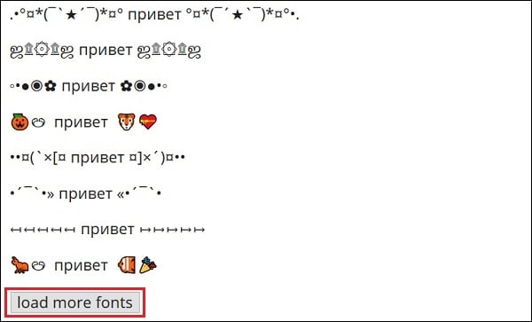 Запустите igfonts.io, в самой верхней форме введите нужную вам фразу кириллицей. Ниже отобразятся созданные сервисом результаты. Если их варианты вас не устроили, нажмите на кнопку «Load more fonts» в самом низу для загрузки очередной порции модификаций. Останется выбрать понравившийся результат, после чего скопировать его в данные вашего профиля (или ваши комментарии) в Instagram.