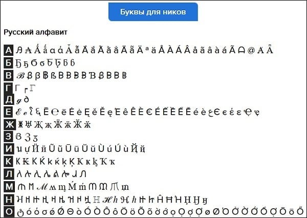 Ярко выраженный игровой сайт cs-mod.ru может также похвалиться подразделом, посвящённым созданию красивых ников русскими буквами для различных сайтов и социальных сетей. Работа ресурса строится на основе использования символов Unicode, позволяя выбрать понравившийся кириллический символ, а затем и вставить его в нужное поле сети Инстаграм.