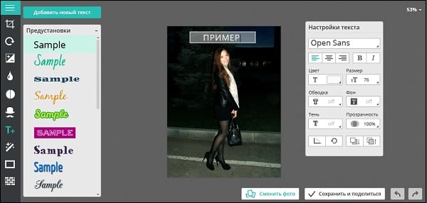 Также для данных целей можно воспользоваться различными графическими редакторами онлайн. Например, запустив сетевой редактор editor.pho.to кликните на «Загрузить фото» для загрузки фото с компьютера. Затем выберите вкладку «Т+» слева и наложите на изображение нужный вам текст. Для сохранения полученного изображения нажмите на «Сохранить и поделиться».