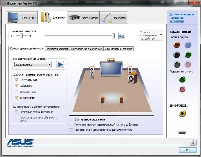 Проблемы с Realtek HD встречаются и другого рода, например – пропал звук. В этом случае не нужно спешить и обвинять в этом систему. Сперва проверьте, корректно ли подключены колонки, наушники. Проверьте, возможно вы перепутали гнездо на панелях (задней, передней), такое случается даже с опытными пользователями. Обычно цвет гнезда и штекера производители обозначают одинаково. Поэтому будет не сложно обнаружить неполадку.