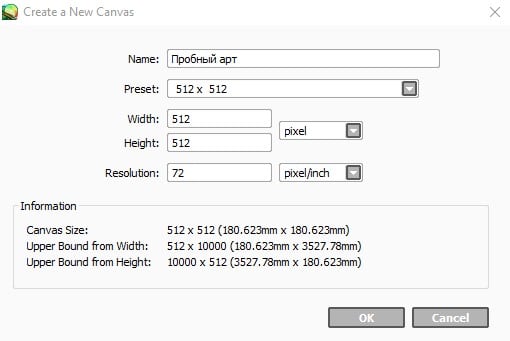 Итак, создадим новый файл, нажав на File в левом верхнем углу. Затем кликнем на New и в открывшемся окне переименуем свой рисунок, например, “Пробный арт”, и зададим параметры будущего произведения.