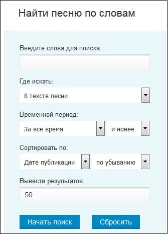 Перейдите на данный ресурс, введите в специальную строку слова из запомнившейся вам песни, выберите поиск в тексте песни, а затем нажмите на кнопку «Начать поиск».