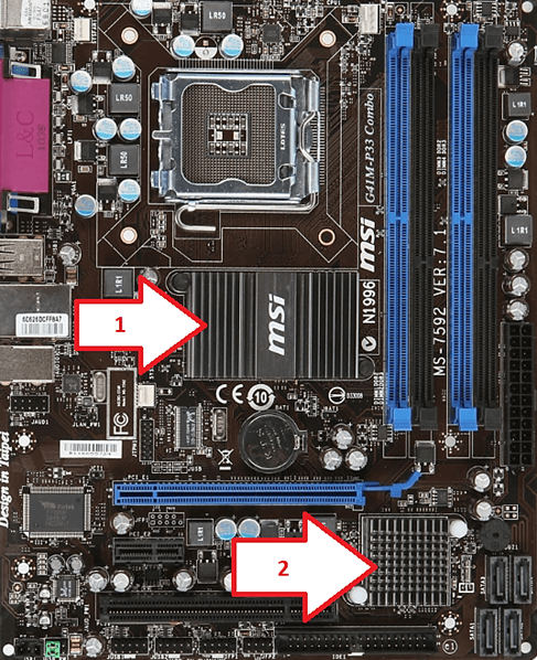 Как уже было сказано, северный мост (на фото № 1) – это чип, который располагается в верхней части материнской платы, сразу под процессором. Такое расположение обусловлено тем, что северный мост подключается напрямую к центральному процессору компьютера. Обычно на северном мосту расположен массивный радиатор или даже радиатор с вентилятором, поскольку данный мост греется значительно сильнее южного.