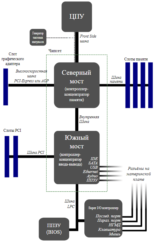 Для того чтобы понять, за что отвечает северный и южный мост достаточно взглянуть на блок схему типичного компьютера.
