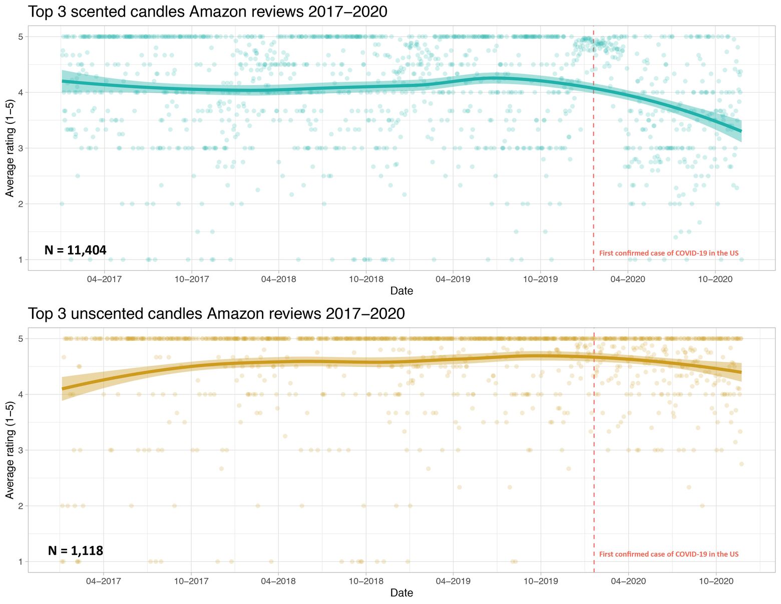 Отзывы покупателей трёх самых популярных продавцов ароматических свечей американской площадки Amazon.com подтвердили наблюдение. С января 2017 по январь 2020 года средний рейтинг колебался в районе 4,3 — 4,5, но затем пошёл на спад.