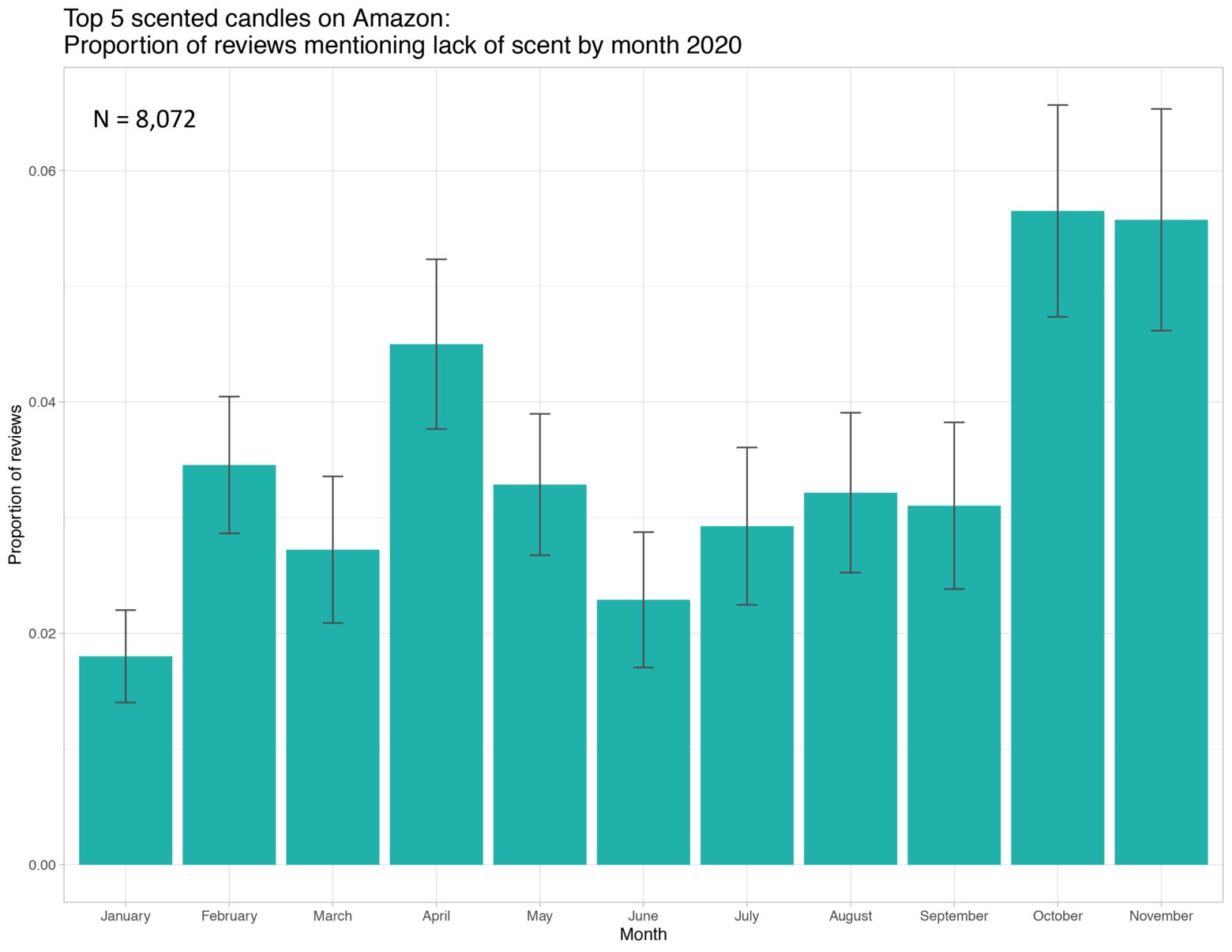 Исследовательница заглянула и в текст обзоров на свечи. В них стали чаще жаловаться на отсутствие запаха. Если в январе таких отзывов было меньше 2 %, то к ноябрю их доля выросла до 6 %. Поиск шёл по фразам вида «no scent» («нет аромата»), «faint smell» («слабый запах») и так далее.