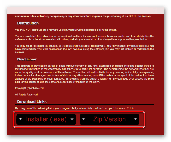 - В самом низу страницы расположены ссылки на скачивание программы в двух видах — в исполнимом файле или в архиве, выбираем любой и загружаем утилиту;