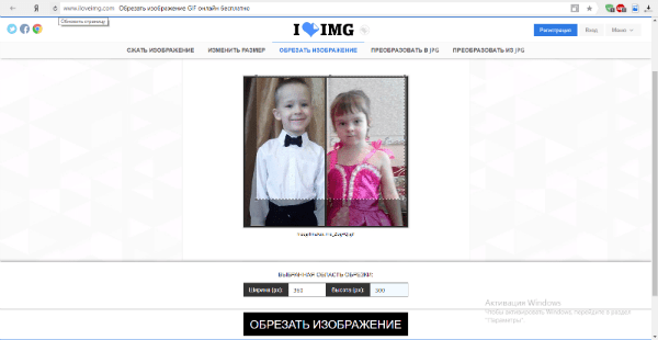 Сначала разберем один из самых популярных онлайн сервисов – IloveIMG. Перейдите на страницу https://www.iloveimg.com/ru/crop-image и загрузите нужное вам gif изображение. Сервис очень прост в использовании. Вы можете установить нужные размеры изображения с помощью сетки либо выбрать область обрезки вводом значений ширины и высоты (в пикселях) при помощи цифр на клавиатуре. Например, вам для размещения на сайте необходима картинка размером 360х300 пикселей. Введите нужные значения и нажмите “Обрезать изображение”.