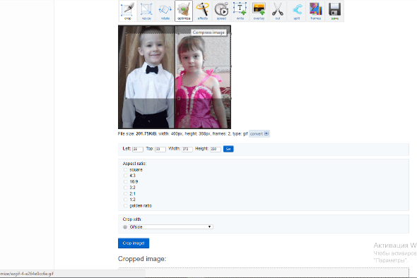 Также прост в использовании сервис Ezgif. Перейдите на страницу https://ezgif.com/crop. Сайт на английском языке, но интерфейс понятен пользователю. Здесь можно загрузить гиф с жесткого диска либо ввести в специальное поле url-адрес картинки (если она взята из интернета). Максимальный размер загружаемого изображения – 30 Мб. После появления фото на экране вы также, как и в сервисе IloveIMG, сможете выбрать нужный размер при помощи размерной сетки или вводом необходимых значений. Кроме этого, сервис предоставляет возможность выбора соотношения сторон.