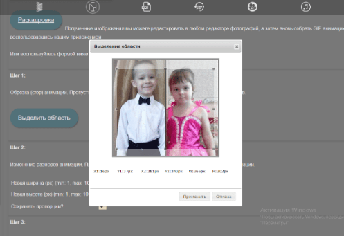 - Затем пролистайте немного вниз и выполните “Шаг 1 – Обрезка анимации”. Для этого выделите область на изображении при помощи сетки.