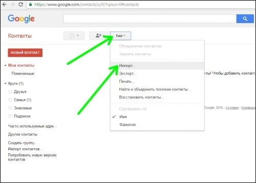 - На открывшейся странице «Google Контакты» нажмите на стрелку рядом с «Ещё» и выберите там «Импортировать»;