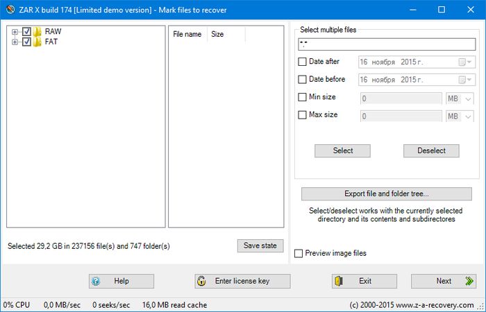 По завершении анализа файлов у вас будет возможность выборочного или полного восстановления. Для полного восстановления с сохранением структуры файлов отметьте опции «RAW» и «FAT» и нажмите «Next».