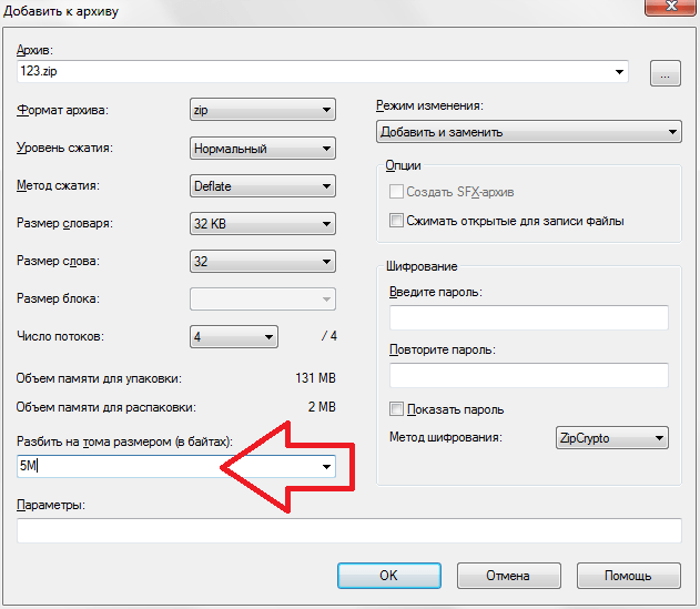 После этого перед вами появится окно с настройками архивирования. Не нужно пугаться такого большого окна с кучей настроек. Здесь все достаточно просто. Для того чтобы получившийся архив можно было без проблем открыть на любом компьютере нужно выбрать «Формат архива – zip». Кроме этого, нужно указать на части какого размера нужно разделять получившейся архив. Для этого нужно указать необходимый размер файла под строкой «Разбить на тома». Размер файла нужно указывать в байтах. При этом вы можете указать «10M», это будет означать, что вы хотите разделить архив на части размеров в 10 мегабайт.