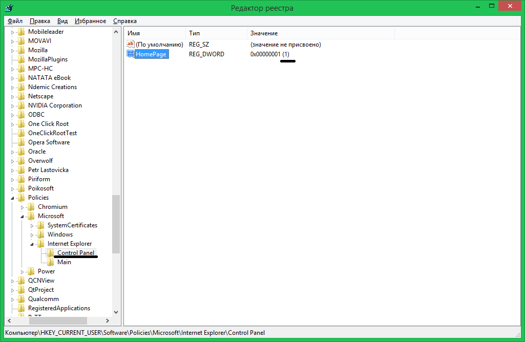 В разделе «Control Panel» найдите параметр «HomePage» и измените его значение на 1.