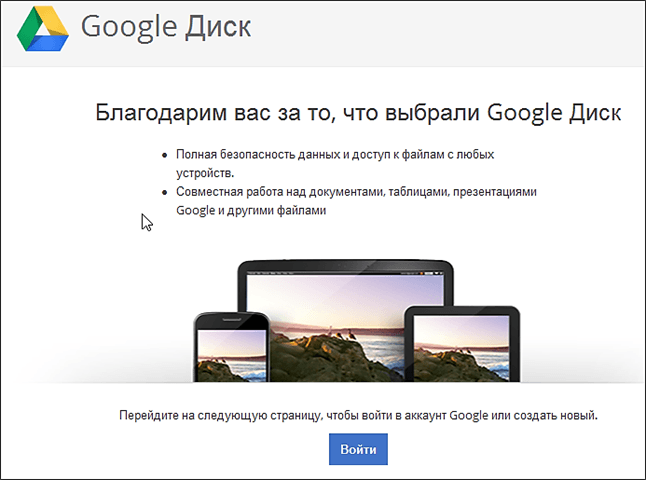 Нажимаем на кнопку «Войти». В следующем окне вам предложат войти в программу Google Drive с помощью аккаунта Google, который мы зарегистрировали на первом этапе.