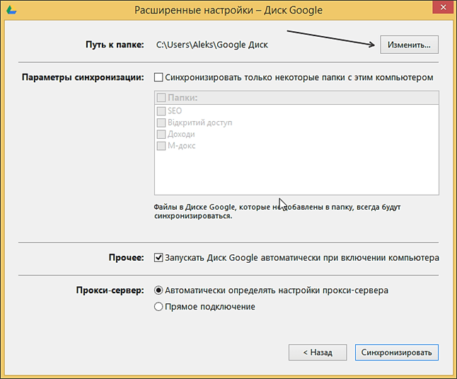 Для того чтобы выбрать нужную папку нажмите на кнопку «Изменить». После того как папка указана программа начинает работу. Все файлы в этой папке синхронизируются с облачным хранилищем Google Drive.