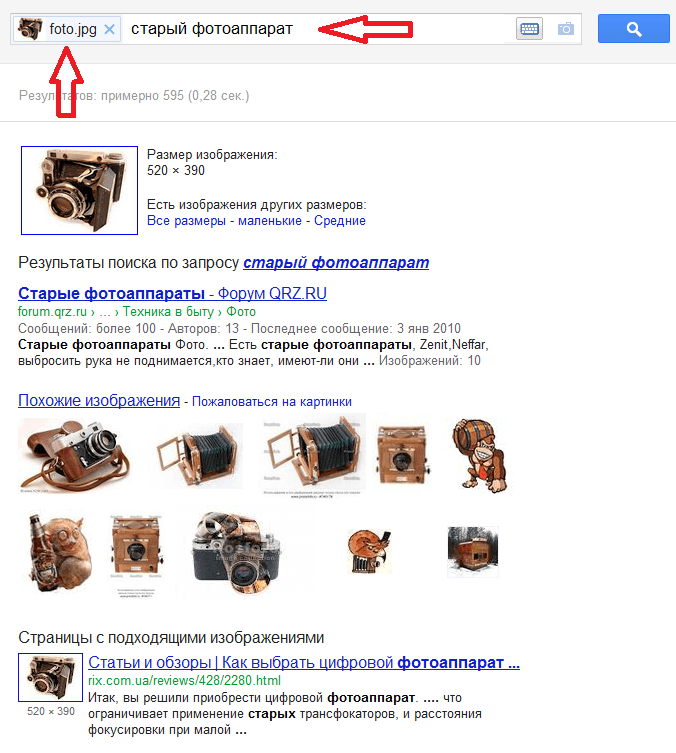В открывшемся окне необходимо кликнуть по значку в виде фотоаппарата. После чего вы сможете указать адрес картинки в Интернете или загрузить ее с вашего компьютера. Для веб-браузера Google Chrome работает прямое перетаскивание картинки в строку поиска. Когда картинка будет загружена, вы сможете увидеть результаты поиска. Здесь вы можете дописать в строку поиска текстовую информацию об объекте, который ищете. Это поможет сделать результаты поиска более точными.