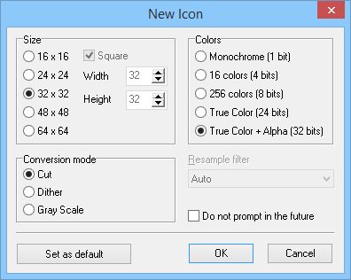 Если вы решите создать иконку с нуля, Junior позволит вам указать несколько основных параметров для файла иконки, которую вам предстоит нарисовать. Вы сможете указать размер значка из нескольких предложенных вариантов (но можно ввести и свои размеры), режим преобразования и режим цвета (от 1 до 32 бит).
