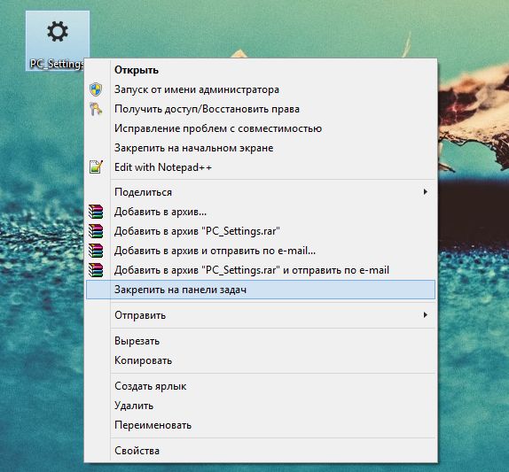 Итак, все, что было нужно сделать, вы только что сделали. Теперь вы можете открывать «Параметры ПК» двойным щелчком мыши по этому файлу. Если вы хотите, чтобы ярлык этого файла появился на панели задач, щелкните по нему правой кнопкой мыши и в контекстном меню выберете «Закрепить на панели задач».