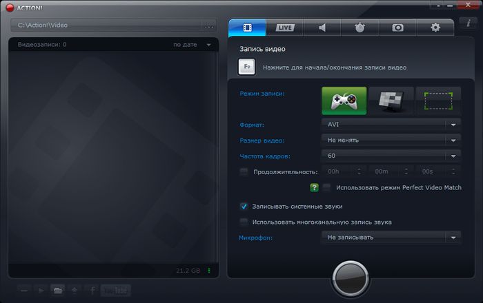 Только что мы рассмотрели настройки Action! для записи видео. Если вы уже закончили с ними, вернитесь на экран для записи видео: