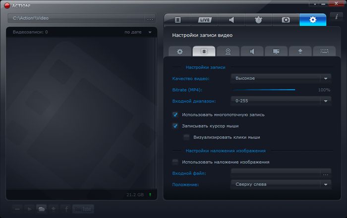 Action! может записывать видео в двух форматах: AVI и MP4. Ну а поскольку у нас есть аппаратное ускорение, запись в AVI нас не интересует.