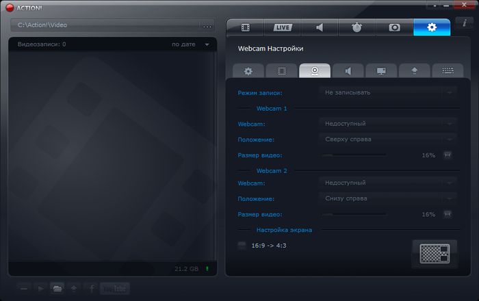 Тут находятся настройки для записи с веб-камеры. Action! может записывать на две веб-камеры одновременно. К моему компьютеру веб-камера не подключена, так что опции в этом разделе у меня отображены серым цветом.