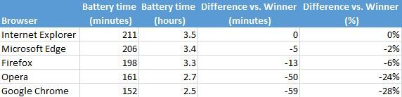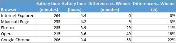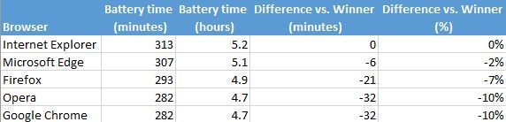 Тем не менее, даже здесь браузеры от Microsoft обеспечили почти один дополнительный час работы по сравнению с аутсайдером Google Chrome.