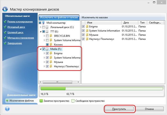 Третий раздел исходного диска F из процесса клонирования исключим целиком. После клонирования как раздел он не перестанет существовать, но будет пустым. По завершению всех операций по исключению папок и файлов из процесса клонирования жесткого диска можем приступать к его запуску. Жмем «Приступить».