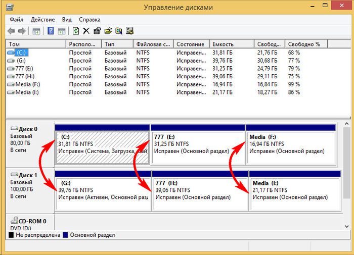 Загрузившись с целевого жесткого диска и попав в систему Windows, первым делом посмотрим на структуру разделов. Запускаем штатную утилиту управления дисками. Поскольку теперь целевой диск стоит первым в приоритете загрузки компьютера, Windows определяет его как Диск 0. Последний стал клоном Диска 1, некогда исходного, с такой же структурой разделов и пропорционально распределённым пространством, согласно структуре исходного жесткого диска.