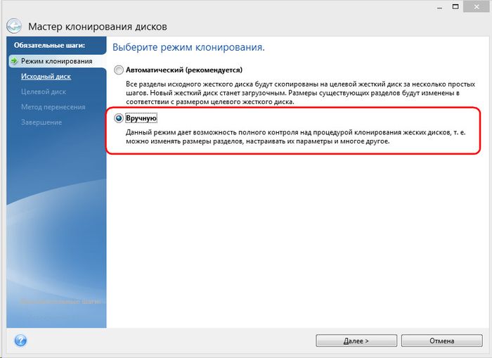 И следуем пошаговому мастеру клонирования дисков. Нам нужен предустановленный автоматический режим клонирования. Жмем «Далее».