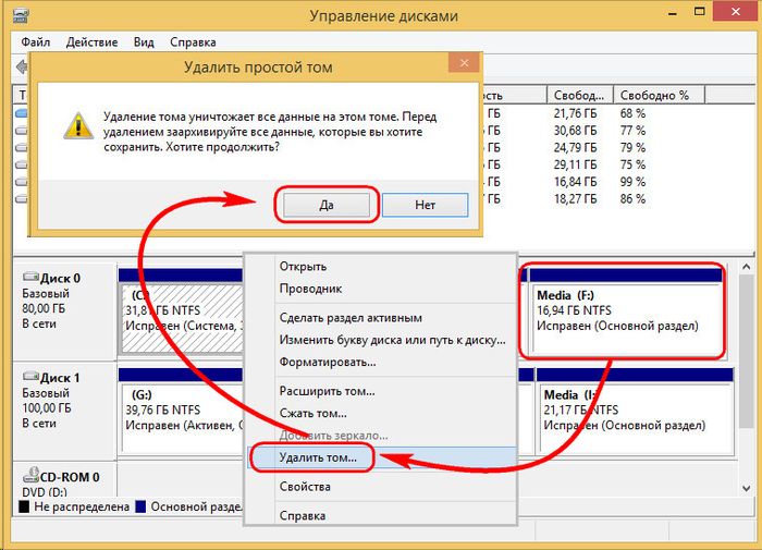 Добавим, к примеру, пространство пустого третьего раздела целевого жесткого диска к его соседу – второму несистемному разделу. Для этого третий раздел F необходимо удалить. В окне утилиты кликаем его, вызываем контекстное меню и выбираем «Удалить том». Подтверждаем действие.