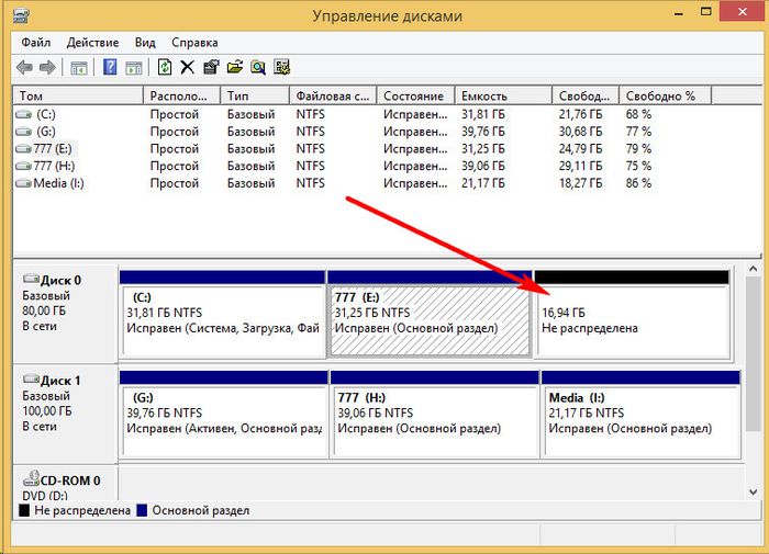 Третий раздел теперь отображается как нераспределенное пространство.