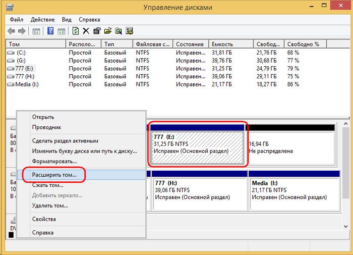 Вызываем контекстное меню на соседнем разделе E и выбираем «Расширить том…».